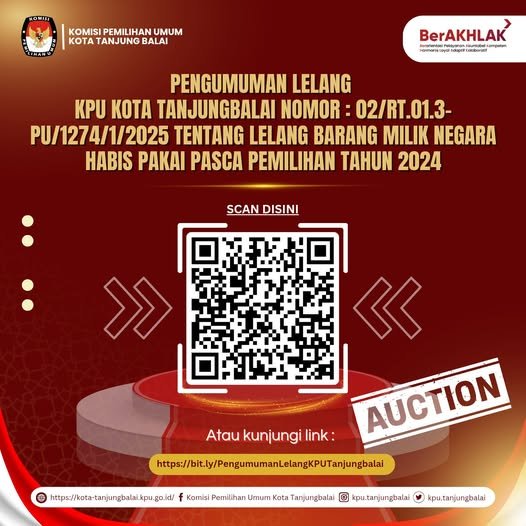 berikut disampaikan Pengumuman Lelang KPU Kota Tanjungbalai Nomor : 02/RT.01.3-Pu/1274/1/2025 tentang Lelang Barang Milik Negara Habis Pakai Pasca Pemilihan Tahun 2024.