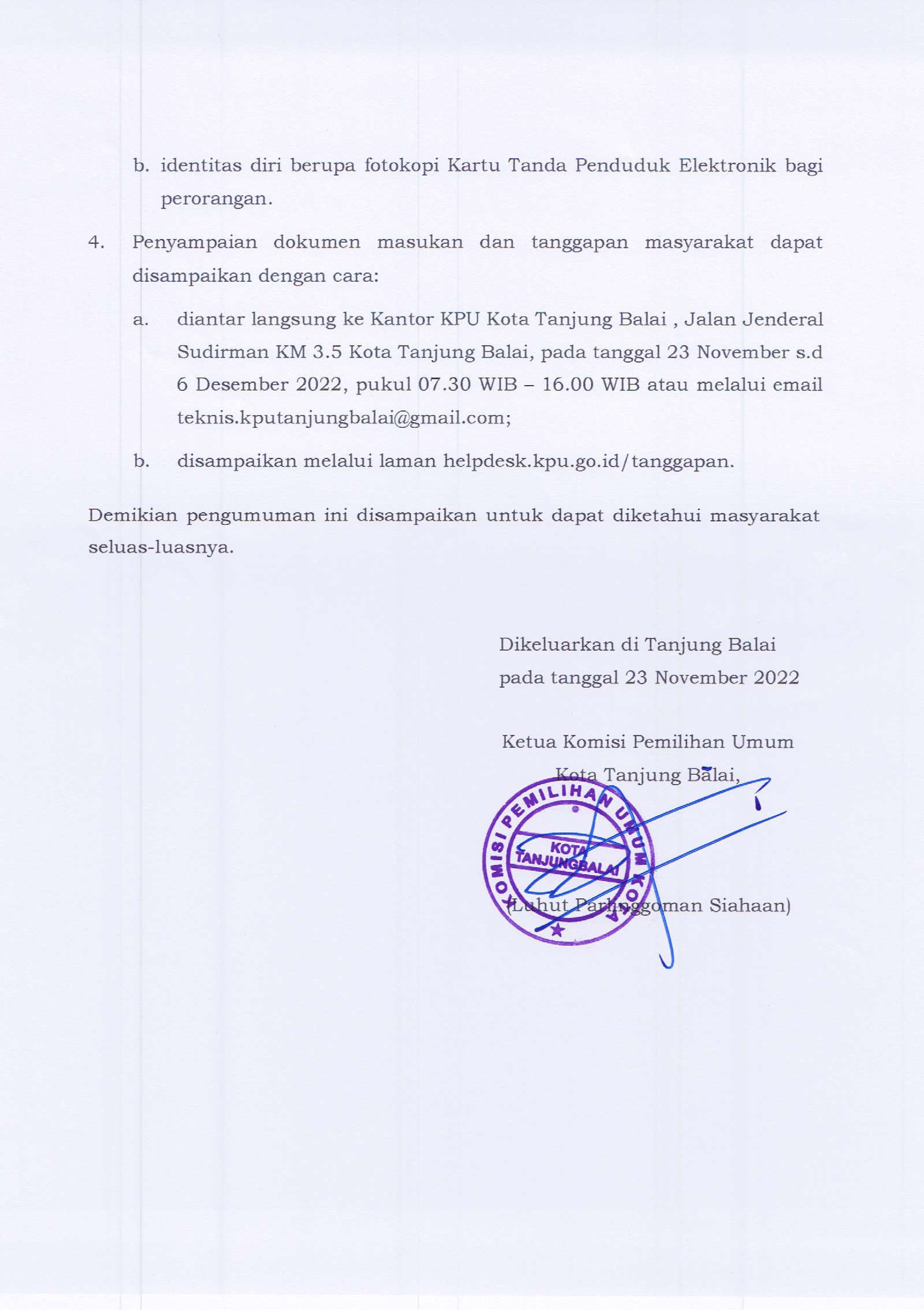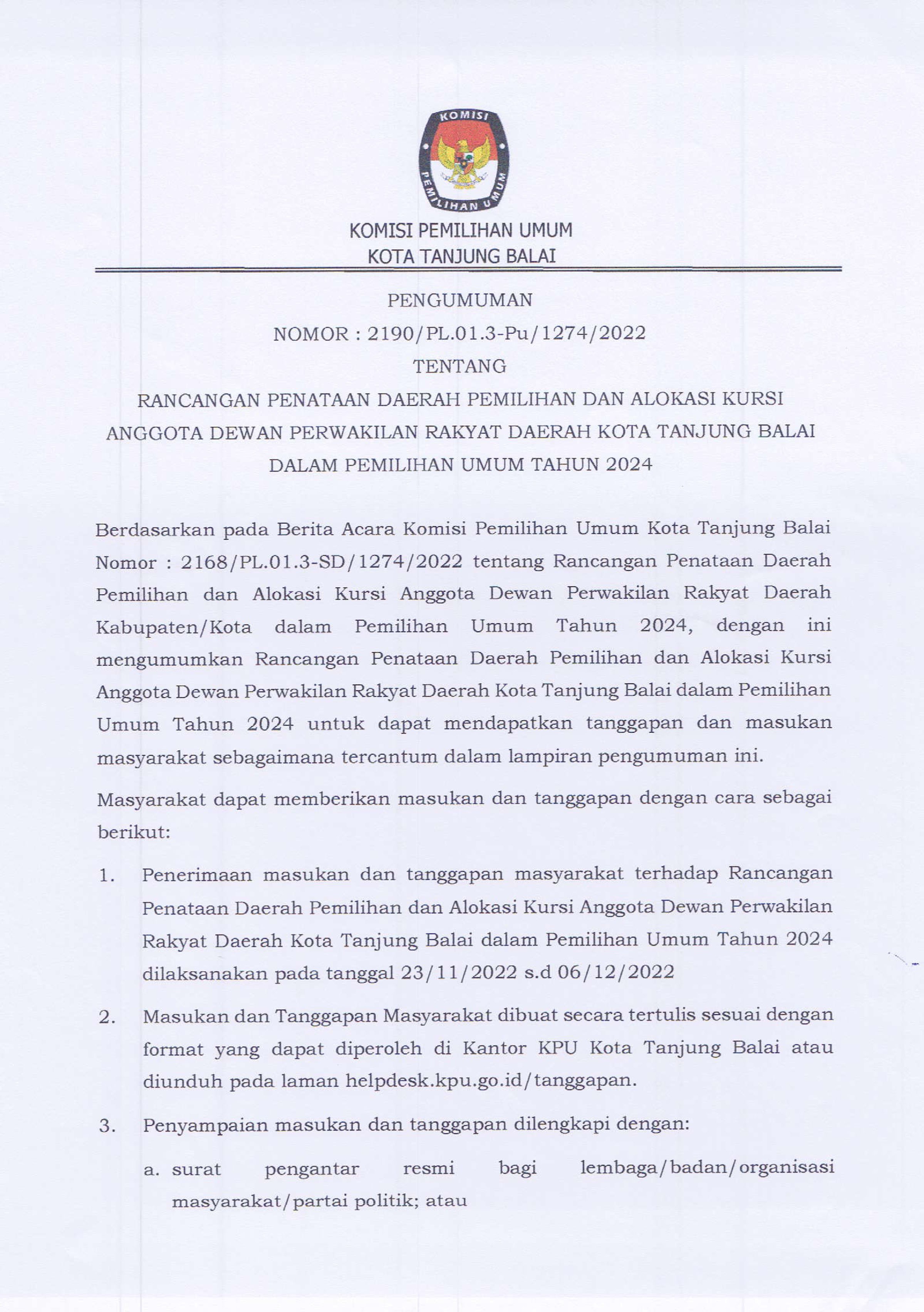 Pengumuman Rancangan Penataan Daerah Pemilihan dan Alokasi Kursi Anggota Dewan Perwakilan Rakyat Daerah Kota Tanjung Balai dalam Pemilihan Umum Tahun 2024