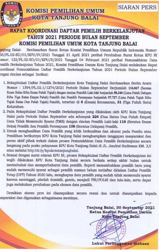 SIARAN PERS RAPAT KOORDINASI PEMUTAKHIRAN DAFTAR PEMILIH BERKELANJUTAN TAHUN 2021 PERIODE BULAN SEPTEMBER