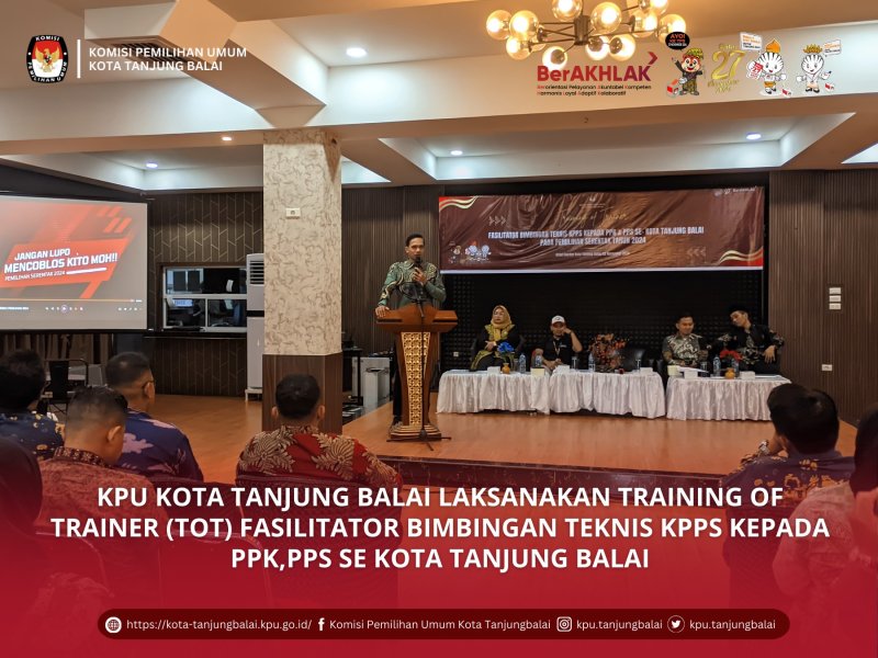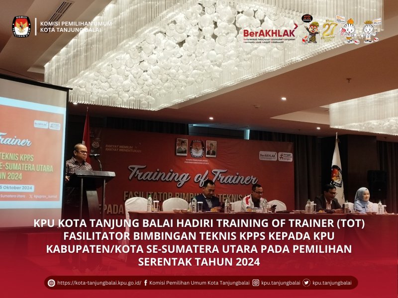 KPU Tanjung Balai berpartisipasi dalam Training of Trainer untuk Fasilitator Bimbingan Teknis Kelompok Penyelenggara Pemungutan Suara (KPPS), yang diselenggarakan oleh KPU Provinsi Sumatera Utara di Grand City Hall Medan. Acara ini merupakan langkah strategis dalam mempersiapkan pelaksanaan Pemilihan Tahun 2024 (25/10/2024).