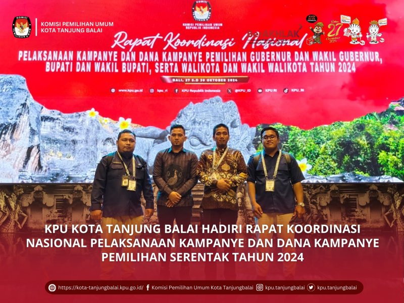 Delegasi KPU Tanjung Balai dihadiri oleh Fitra Ramadhan Panjaitan, Ketua KPU Tanjung Balai, Ulil Amri, Anggota KPU Tanjung Balai Divisi Sosialisasi, Pendidikan Pemilih, Partisipasi Pemilih dan SDM, Suci, Anggota KPU Tanjung Bagai Divisi Hukum dan Pengawasa. Serta hadir Jajaran Sekretariat KPU Tanjung Balai, Lidia M Magfiroh Siregar, Kasubag Hukum dan SDM serta Jefri Errada, Staf Sub Bagian Teknis Penyelenggara Pemilu.