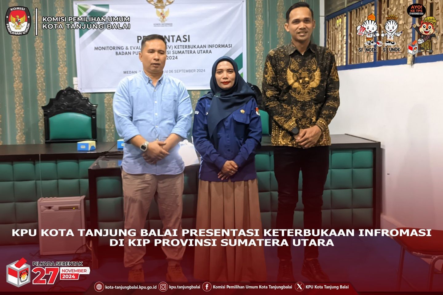 KPU Kota Tanjung Balai hadiri Persentasi berkenaan dengan Keterbukaan Informasi Publik pada Kategori OPD, Kabupaten/Kota, Desa, BUMD, Penyelenggara Pemilu, Lembaga Vertikal Pada tanggal 03 s/d 04 September 2024 di Kantor Komisi Informasi Provinsi Sumatera Utara Jl. Alfalah No. 22, Kel. Suka Maju, Kec. Medan Johor, Medan
