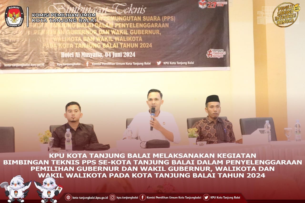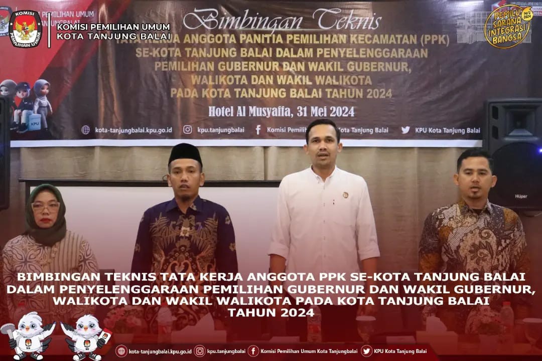 KPU Kota Tanjung Balai melaksanakan kegiatan Bimbingan Teknis Tata Kerja Anggota Panitia Pemilihan Kecamatan (PPK) Se-Kota Tanjung Balai Dalam Penyelenggaraan Pemilihan Gubernur dan Wakil Gubernur, Walikota dan Wakil Walikota Pada Kota Tanjung Balai Tahun 2024 Jumat 31 Mei 2024 bertempat di Hotel Al Musyaffa Kota Tanjung Balai. Kegiatan ini dibuka langsung oleh Ketua KPU Kota Tanjung Balai, Fitra Ramadhan Panjaitan, yang didampingi oleh anggota KPU lainnya yaitu Delila, Ulil Amri, Suci, dan Zainul Arifin DMK. Kehadiran jajaran Sekretariat KPU Kota Tanjung Balai juga menambah semarak acara ini. Dan dihadiri oleh Ketua dan Anggota PPK Se-Kota Tanjung Balai. Tidak hanya dihadiri oleh pihak internal KPU, Bimtek ini juga mengundang Perwakilan dari Persatuan Wartawan Indonesia (PWI) Kota Tanjung Balai dan Ketua Badan Pengawas Pemilu (Bawaslu) Kota Tanjung Balai sebagai narasumber. Mereka memberikan materi yang sangat penting bagi para peserta Bimtek, yang diharapkan dapat meningkatkan kualitas penyelenggaraan Pilkada di Kota Tanjung Balai. Dalam sambutannya, Fitra Ramadhan Panjaitan menekankan pentingnya koordinasi dan kerja sama antara berbagai pihak dalam mensukseskan Pilkada yang akan datang. "Kami berharap dengan adanya Bimtek ini, para anggota PPK dapat lebih memahami tugas dan tanggung jawab mereka, sehingga Pilkada bisa berjalan dengan lancar dan demokratis," ujarnya. Kegiatan Bimtek ini diharapkan dapat mempersiapkan anggota PPK Se-Kota Tanjung Balai dengan baik dalam menghadapi berbagai tantangan yang mungkin muncul selama proses pemilihan. Dengan pembekalan yang matang, diharapkan Pilkada Serentak Tahun 2024 di Kota Tanjung Balai dapat berjalan sukses, aman, dan sesuai dengan prinsip-prinsip demokrasi. Acara ini berakhir dengan sesi tanya jawab interaktif, di mana peserta dapat langsung berdiskusi dengan narasumber mengenai berbagai isu terkait Pilkada. Semangat dan antusiasme peserta terlihat jelas, menandakan kesiapan mereka dalam menyukseskan Pilkada Serentak Tahun 2024.