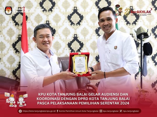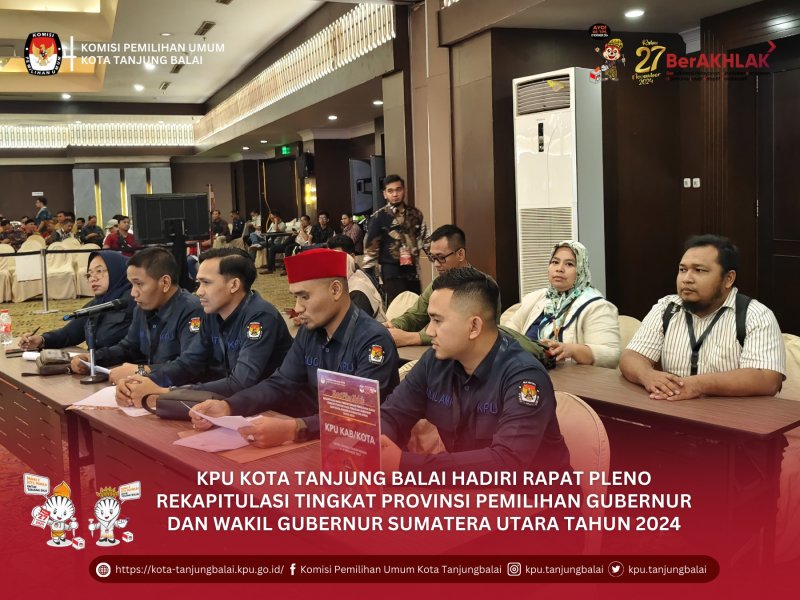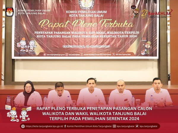 KPU Kota Tanjung Balai menggelar Rapat Pleno Terbuka Penetapan Pasangan Calon Walikota dan Wakil Walikota Kota Tanjung Balai Terpilih Pada Pilkada Serentak Tahun 2024 bertempat di Grand Singgie Hotel Tanjung Balai, Kamis (09/01/25). Pelaksanaan Rapat Pleno Terbuka ini dipimpin oleh Ketua KPU Kota Tanjung Balai, Fitra Ramadhan Panjaitan didampingi Anggota KPU Kota Tanjung Balai Delila, Suci, Ulil Amri dan Zainul Arifin Damanik.