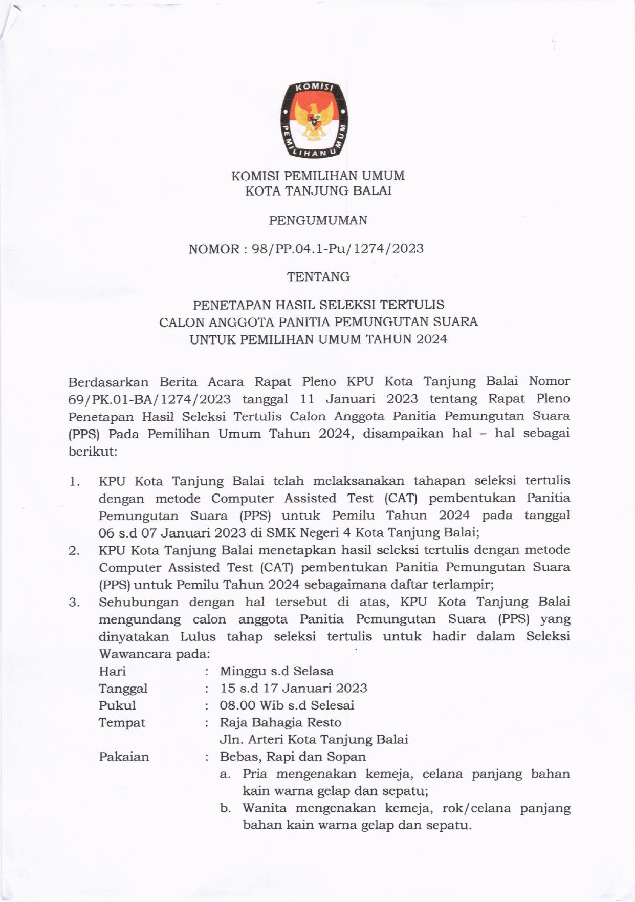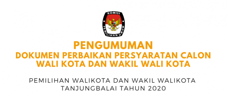 KPU Tanjungbalai – Dalam rangka memenuhi ketentuan Pasal 91 ayat (1) Peraturan Komisi Pemilihan Umum Nomor 3 Tahun 2017 tentang Pencalonan Pemilihan Gubernur dan Wakil Gubernur, Bupati dan Wakil Bupati, dan/atau Walikota dan Wakil Walikota sebagaimana telah beberapa kali diubah, terakhir dengan Peraturan Komisi Pemilihan Umum Nomor 9 Tahun 2020 tentang Perubahan Keempat Atas Peraturan Komisi Pemilihan Umum 3 Tahun 2017 tentang Pencalonan Pemilihan Gubernur dan Wakil Gubernur, Bupati dan Wakil Bupati, dan/atau Walikota dan Wakil Walikota jo. Berita Acara Pendaftaran dan Tanda Terima Penyerahan Dokumen Perbaikan Persyaratan Calon dalam Pemilihan Wali Kota dan Wakil Wali Kota Tanjungbalai Tahun 2020 (Model TT.2-KWK), dengan ini Komisi Pemilihan Umum Kota Tanjungbalai mengumumkan Dokumen Perbaikan Persyaratan Calon Wali Kota dan Wakil Wali Kota Tanjungbalai Tahun 2020 yang telah diterima Dokumen Perbaikan Persyaratan Calon, sebagai berikut KLIK DISINI
