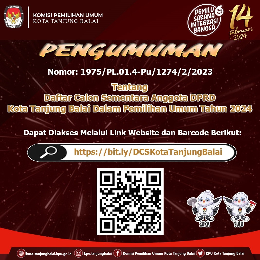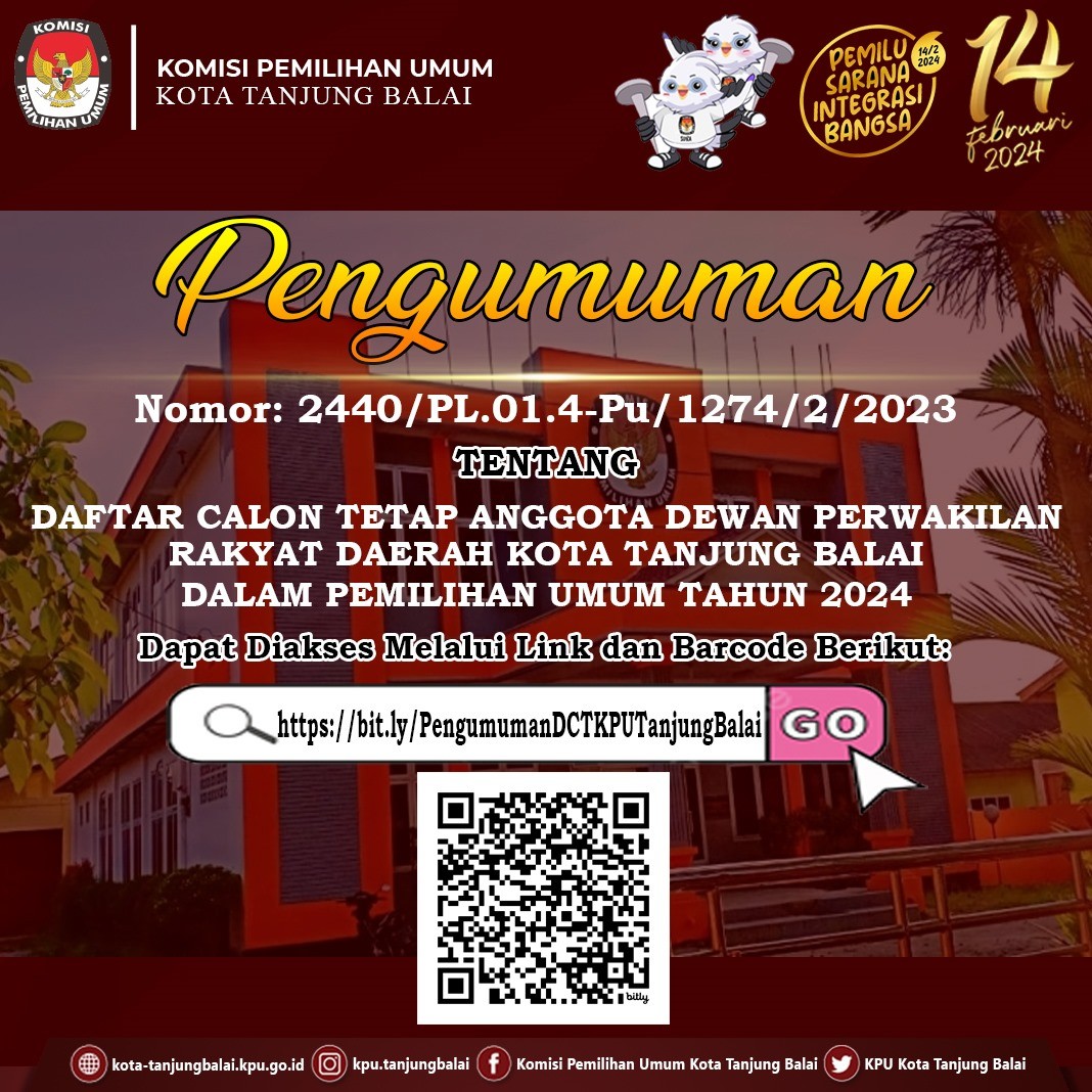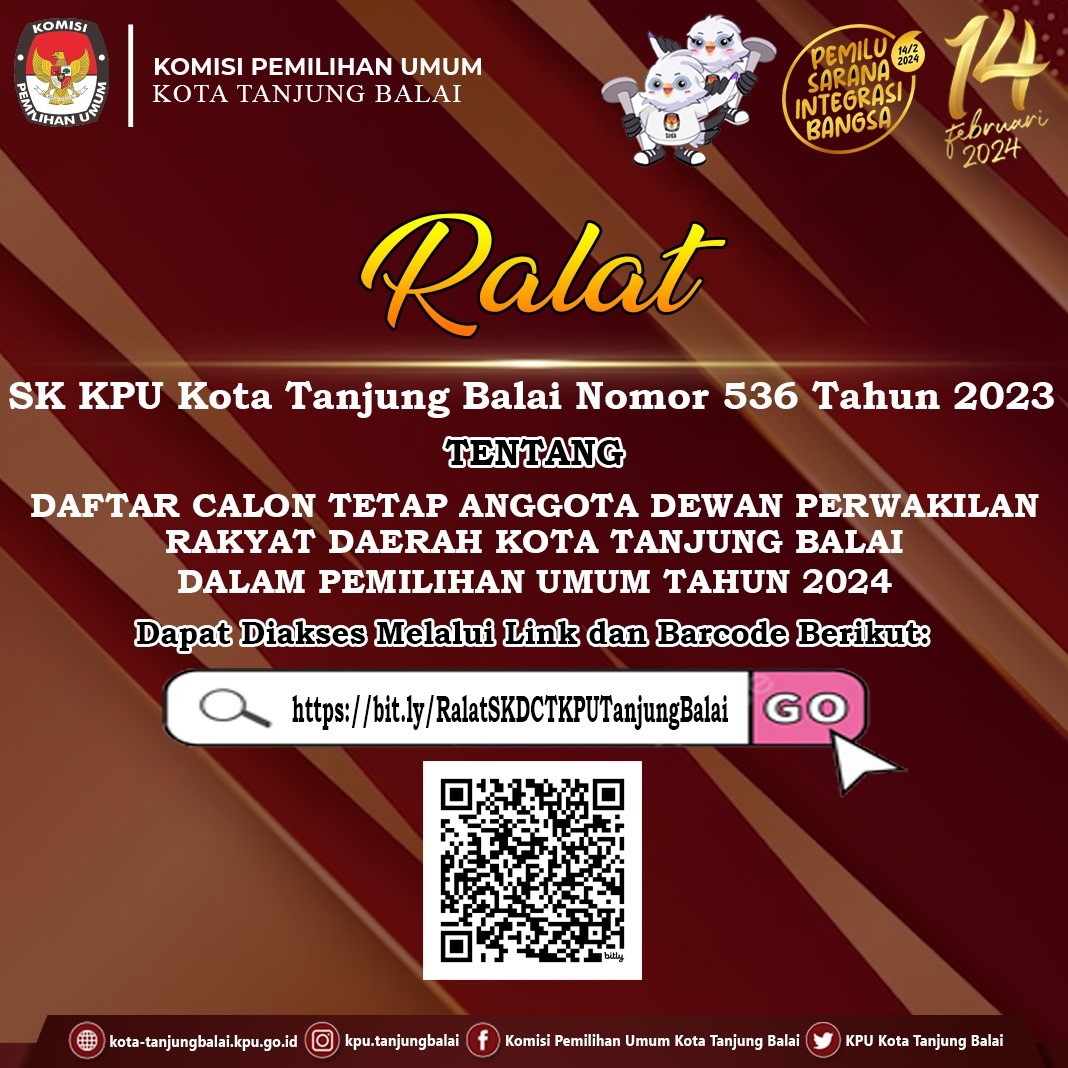 Berikut disampaikan Ralat terhadap Keputusan Komisi Pemilihan Umum Kota Tanjung Balai Nomor 536 Tahun 2023 1. Oleh karena terdapat kekeliruan penulisan dalam Keputusan Komisi Pemilihan Umum Kota Tanjung Balai Nomor 536 Tahun 2023 tentang Daftar Calon Tetap Anggota Dewan Perwakilan Rakyat Daerah Kota Tanjung Balai Dalam Pemilihan Umum Tahun 2024 bersama ini disampaikan ralat sebagai berikut: a. Penulisan LAMPIRAN MODEL DCS.DPRD KAB/KOTA yang terletak pada LAMPIRAN XVIII Keputusan dimaksud, menjadi sebagai berikut “LAMPIRAN MODEL DCT.DPRD KAB/KOTA”; b. Penulisan KOMISI KOMISI PEMILIHAN UMUM KOTA TANJNG BALAI yang terletak pada Lampiran XVIII keputusan dimaksud, menjadi sebagai berikut “KOMISI PEMILIHAN UMUM KOTA TANJUNG BALAI”; dan c. Penambahan Kalimat “KOMISI PEMILIHAN UMUM KOTA TANJUNG BALAI” yang terletak pada Lampiran I s.d Lampiran XVII. 2. Berkenaan dengan hal tersebut di atas, dilampirkan Naskah sesuai dengan aslinya yang telah diperbaiki. 3. Kami sertai dengan permintaan agar untuk selanjutnya Keputusan Komisi Pemilihan Umum Kota Tanjung Balai Nomor 536 Tahun 2023 yang telah diperbaiki menjadi pedoman dalam Keputusan dimaksud Melalui pemberitahuan ralat ini Keputusan KPU Kota Tanjung Balai yang telah beredar sebelum pemberitahuan ini, tetap dinyatakan benar sepanjang dimaknai sebagaimana dimaksud pada angka 1. Ralat SK KPU Nomor 536 Tahun 2023 dapat diunduh melalui link https://bit.ly/RalatSKDCTKPUTanjungBalai